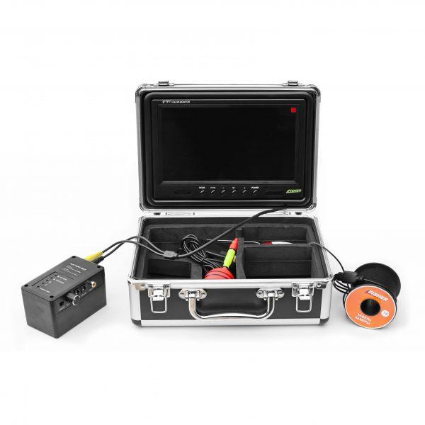 Монітор цього пристрою має розмір 9 дюймів і дозволяє розглядати об'єкти різних розмірів. А для того, щоб блиці сонця, в ясну погоду, не перешкоджали дивитися на монітор, в камері передбачений козир, який дозволить захистити екран. Зовнішній акумулятор напруженості в 12 Вольт і місткість в 4500 мАч дозволить вам протягом 5-7 годин, при 20 градусах метусії, насолоджуватися пейзажами підводного світу. Камера має 12 вбудованих інфрачервоних світлодіодів, що дасть вам можливість вивчати придонні об'єкти навіть у повній темряві. Якщо необхідно, ви можете вимкнути світлодіоди. Кабель з камерою зручно намотується на окрему бабину, і ви завжди зможете відмотати потрібний вам розмір. Для зручності транспортування камери та всіх компонентів виробник спакував все у зручний алюмінієвий чемоданчик з ручкою для перенесення, що є величезним плюсом.