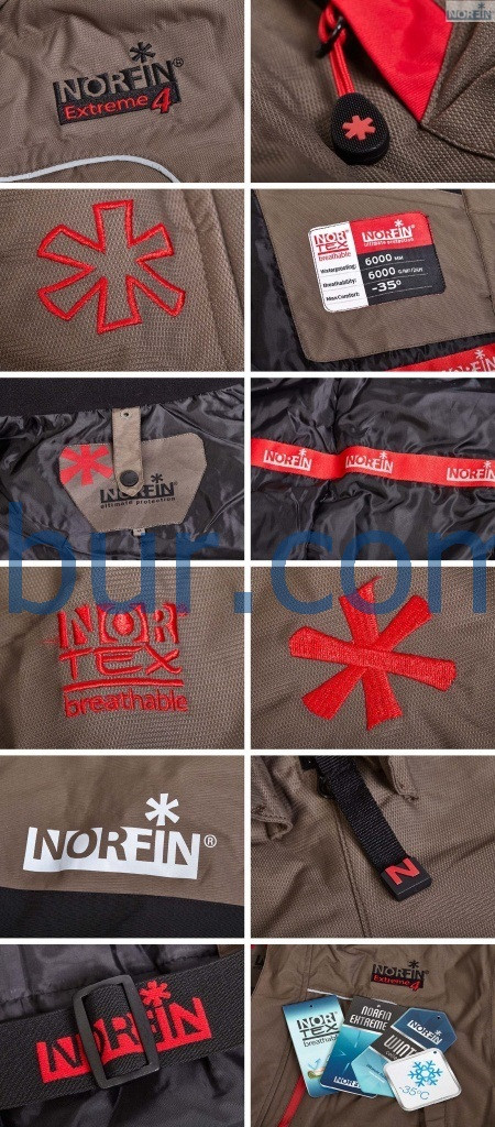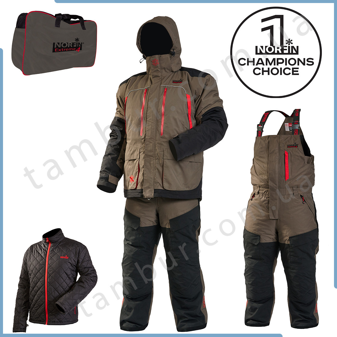 Продовження популярної серії костюмів, призначених для зимової риболовлі. Костюм NORFIN EXTREME 4 складається з напівкомбінезона та куртки зшитих із вітро- та вологостійкого мембранного матеріалу NORTEX BREATHABLE. Утеплювач відстібної вітронепродувної внутрішньої куртки — HOLLOFIL. Завдяки сучасному дизайну внутрішня куртка має гарний вигляд під час носіння окремо від костюма. Зимовий костюм NORFIN EXTREME 4 призначений для експлуатації за температури -35 °C.
