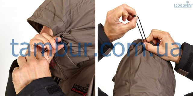 Ширину нижньої частини куртки, за потреби, можна відрегулювати за допомогою еластичної стяжки та фіксатора. Куртка, після такої припасування по фігурі, краще зберігає накопичене тепло під одягом.