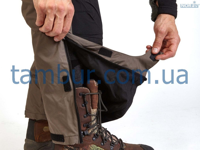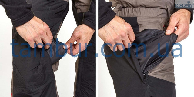 Регульована нижня частина штанів, із застібками-блискавками, максимально зручна для носіння напівкомбінезона поверх черевиків. Така конструкція напівкомбінезона дає змогу роздягтися, не знімаючи взуття.