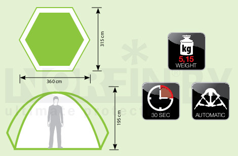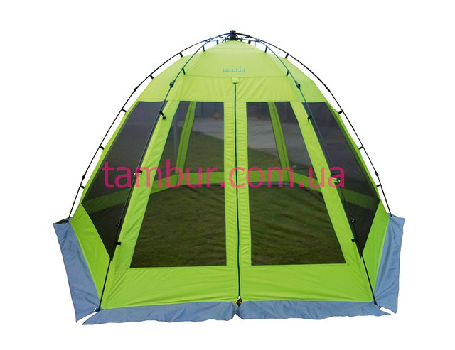 Напівавтоматичний каркасний тент-намет. Призначений для використання в якості укриття від сонця, захисту від комах, а також для ночівлі під час туристичних походів, відпочинку на природі, полювання або риболовлі. Один вхід. Вітрозахисна спідниця. Легко встановлюється однією людиною.